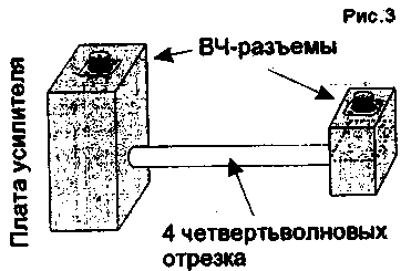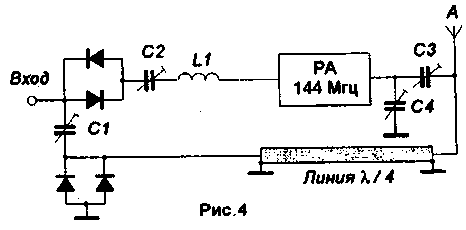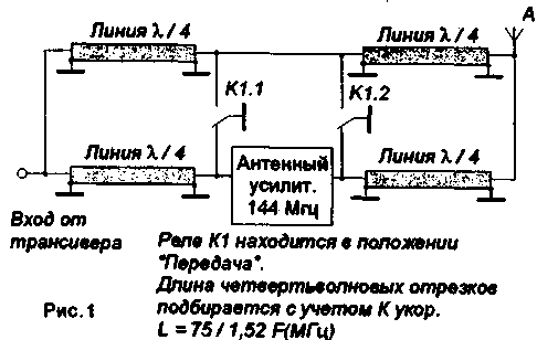 Из теории длинных линий известно, что четвертьволновый отрезок коаксиального кабеля, короткозамкнутый на конце, на резонансной частоте имеет бесконечно большое сопротивление. Из-за отсутствия высокочастотных коаксиальных реле длительное'время использую это свойство для коммутации антенного усилителя, рис.1. ![]() В режиме приема на антенный усилитель и обмотки реле подано напряжение питания. Четвертьволновые отрезки, подключенные к входу и выходу усилителя являются продолжением соединительного кабеля и при Rвх к Rвых, равного волновому сопротивлению кабеля не оказывают влияния на параметры фидера. Четвертьволновые отрезки, предназначенные для "обхода", короткозамкнутыми отрезками со стороны антенны и трансивера имеют большое сопротивление. Их амплитудно-частотная характеристика (АЧХ) приведена на рис.2. ![]() Таким образом, кроме чисто изоляционных свойств они обладают и фильтрующими свойствами, являясь довольно эффективным фильтром с крутыми скатами, обусловленными высокой добротностью на резонансной частоте. В режиме передачи питание с усилителя снимается, а его вход и выход заземляются, что обеспечивает практически полную гарантию защищенности от проникновения ВЧ сигнала передатчика. Кроме того, четвертьволновые отрезки, подключенные непосредственно к входу и выходу антенного усилителя, являются режекторными фильтрами для передатчика, а два других отрезка, соединенные последовательно, имеют длину, равную 0,5 лямбда и обладают свойством трансформатора сопротивлений 1:1, не оказывая влияния на параметры фидера. В качестве коммутационных реле могут использоваться любые, имеющиеся в наличии. Основное требование к реле - как можно меньшая межконтактная емкость. Хорошие результаты получаются при использовании РЭС-34, РПВ-2/7 и т.п. при выходной мощности до 200 Вт. Вариант изготовления антенного коммутатора приведен на рис.3. ![]() Четыре четвертьволновых отрезка кабеля, длиной 342 мм для частоты 144,1 МГц размещаются в дюралевой трубе длиной 340 мм и диаметром 30 мм. Один конец трубы завальцован в небольшую коробку с двумя высокочастотными коаксиальными разъемами (справа на рисунке), разделенными экраном. Другой конец завальцован в большую коробку (слева на рисунке), в которой находятся два реле и плата усилителя мощности, рис.3. Следует учитывать требования к монтажу высокочастотных устройств и обязательно отделять экраном входную цепь от выходной. На этом же принципе, основываясь на свойстве четвертьволнового отрезка, осуществляется безрелейная коммутация 20-ти ваттного усилителя мощности, установленного в автомобиле. Вместо высокочастотных реле используется диодная коммутация - встречно-параллельное включение кремниевых диодов КД503Б, рис.4. ![]() В режиме передачи ВЧ сигнал трансивера открывает ключи и четвертьволновый отрезок со стороны входа РА оказывается короткозамкнутым, а со стороны антенны имеет большое сопротивление. В режиме приема мощности сигнала, поступающего из антенны, недостаточно для того, чтобы открыть ключи и сигнал через четвертьволновый отрезок беспрепятственно проходит на вход трансивера. При очень большом сигнале диодные ключи выполняют защитную функцию. Усилитель мощности собран на транзисторах КТ925А и КТ925В по схеме, опубликаванной в "Р-Д" №1-96. На его вход с "ручного" трансивера подается 100 мВт, а 