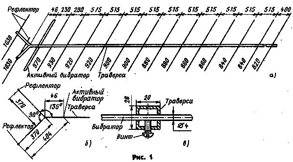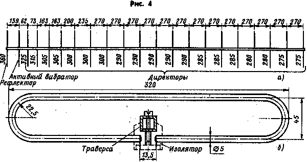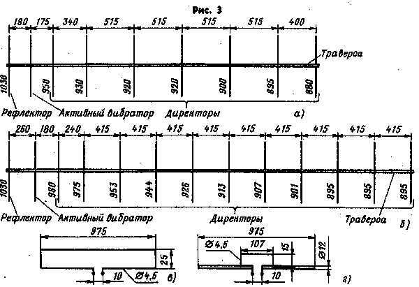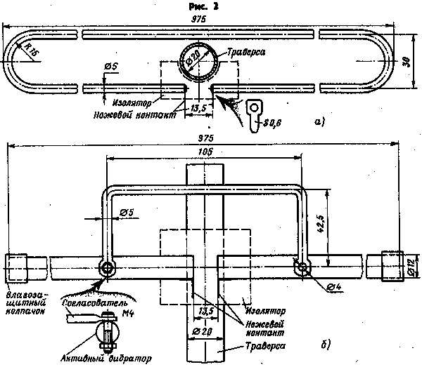 Интенсивное освоение радиолюбителями УКВ диапазонов за последние два десятилетия привело к появлению множества разнообразных по своим конструкциям антенн. Особое распространение в последние годы получили антенны с удлиненной траверсой. Длина траверсы такой антенны составляет несколько длин волн, а число пассивных элементов достигает двух десятков и даже более. Именно их нередко используют ультракоротковолновики при проведении дальних и сверхдальних связей на УКВ через «аврору», метеорные потоки, ИСЗ и лунную поверхность. Интерес к антеннам с удлиненной траверсой можно объяснить тем, что, во-первых, при практически таких же затратах материалов, что и на постройку обычного «волнового канала», усиление у них заметно больше; во-вторых, конструкция таких антенн несложная, так как все элементы крепятся на одной несущей траверсе; в-третьих, подкупает относительная простота согласования антенны с фидером, ибо ВЧ энергия подводится только к одному активному элементу. Но этим антеннам свойственны и некоторые недостатки: малое подавление излучения назад и значительное сужение рабочей полосы при увеличении числа элементов. Ряд интересных конструкций УКВ антенн с удлиненной траверсой разработал известный французский ультракоротковолновик Ф. Тонна (F9FT). Антенны F9FT имеют достаточно высокий КПД, сравнительно небольшие размеры и массу, в них нет согласующих элементов. Но пожалуй, их главное достоинство — легкая повторяемость, получение идентичных параметров каждой отдельной антенны (при строгом соблюдении всех размеров элементов). Последнее позволяет путем компоновки нескольких однотипных антенн создавать сложную антенную систему с большим коэффициентом усиления. Основные параметры антенны F9FT приведены в таблице. Приведенные значения усиления антенн даны относительно полуволнового диполя. ![]() На рис. 1, а приведен чертеж 16-элементной антенны для 2-метрового диапазона. Ее траверсу выполняют из проката квадратного профиля со стороной 20 мм, толщина стенки — 1,5...2 мм, или трубы диаметром 20 мм. Часть траверсы, где укрепляют рефлекторы и активный вибратор, имеет вид «ласточкиного хвоста» (рис. 1, б). Пассивные элементы изготавливают из алюминиевой проволоки диаметром 4 мм. Применение других материалов (меди, латуни, сплавов алюминия, биметалла) не вызывает заметного ухудшения параметров антенны, за исключением ее массы. Один из возможных вариантов крепления рефлекторов и директоров показан на рис. 1, в. ![]() Активный вибратор с волновым сопротивлением 75 Ом (рис. 2, а) выполняют из алюминиевой проволоки диаметром 5 мм, а с волновым сопротивлением 50 Ом (рис. 2, б) — из двух алюминиевых трубок диаметром 12 мм, соединенных алюминиевой дужкой-согласователем из проволоки диаметром 5 мм. Основные параметры антенн ![]() Активный вибратор должен быть надежно изолирован от траверсы. В качестве изоляционного материала можно использовать стеклотекстолит, тефлон, органическое стекло и т. п. ![]() На рис. 3, а и 3, б схематически изображены 9- и 13-элементная антенны для 2-метрового диапазона. Конструкция активных вибраторов с различным волновым сопротивлением для этих антенн показана на рис. 3, в (75 Ом) и 3, г (50 Ом). Некоторое различие в размерах данных активных вибраторов от тех, которые применяются в 16-элементной антенне, обусловлено стремлением лучше согласо