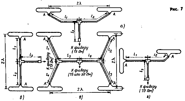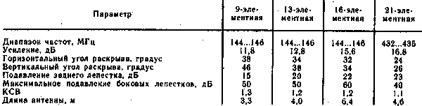 Данная антенная система с круговой поляризацией имеет коэффициент усиления такой же, что и одиночная антенна. В заключение несколько, практических советов. Для удобства и быстрой сборки антенных систем рекомендуется отрезки кабелей согласования снабжать высокочастотными разъемами типов СР-75 и СР-50, а для их соединения использовать ВЧ тройники. Такие узлы нетрудно защитить от влияния атмосферных осадков. Если указанных разъемов нет, ртрезки кабелей можно аккуратно спаять, а места соединения покрыть полистиролом или эпоксидной смолой. Все крепежные винты желательно ставить с нижней стороны траверсы и закрашивать их. Трубки элементов с концов закрывают капроновыми колпачками или резиновыми пробками. Места подключения кабелей к вибраторам желательно помещать в капроновые стаканы. Чтобы длинные траверсы не прогибались, их можно обычным способом подпереть диагональными штангами. Последние должны быть одинаковой длины для всех антенн, скомпонованных в систему. К. Фехтел (UB5WN) г. Киев, "Радио" N3, 1983г.
