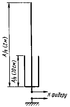 метром 6 мм и толщиной стенок 1 мм, перемещением которой и настраивают антенну. "Стакан" выполнен из трубки диаметром 8 мм и толщиной стенок 0,5 мм. В нижней его части имеется металлическая вставка, через которую положение "стакана" на излучателе фиксируется с помощью стопорного винта. В верхней части "стакана" имеется вставка из тефлона или любого другого высокочастотного диэлектрика, которая фиксирует его положение по отношению к основному излучателю и исключает попадание атмосферных осадков в "стакан". Диаметр излучателя 4 мм в данном варианте практического исполнения антенны выбран из чисто конструктивных соображений - соответствует диаметру центрального контакта разъема PL-259 (нижний конец излучателя выполняет функции этого контакта). При других вариантах исполнения антенны диаметр излучателя , естественно, может быть и другим, но тогда надо пропорционально изменить и диаметр трубки, образующей "стакан", а также верхней регулирующей насадки на излучателе. "Земля" у этой антенны обычная: противовесы на каждый диапазон (не менее трех), металлическая поверхность (крыша автомобиля) и т.п. Кстати, эта антенна может быть выполнена и как обычный диполь, состоящий из двух таких излучателей. Настройка антенны осуществляется по минимуму КСВ на обоих диапазонах подбором длины излучателя и, в небольших пределах, положения "стакана" на излучателе. Начинать надо с самого нижнего положения "стакана". Сначала подбором длины излучателя антенну настраивают на диапазоне 144 МГц. Затем, изменяя положение "стакана", добиваются минимума КСВ на диапазоне 430 МГц. После этого при необходимости подстраивают антенну на диапазоне 144 МГц.
