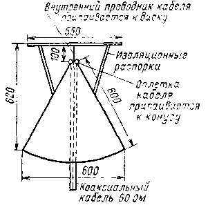 Puc.1 Конус изготовляется в виде рупора из листа меди или какого-либо другого материала, который легко паять. Кабель питания проводится внутри конуса и его внешняя оплетка припаивается к конусу, а очищенный отрезок внутренней жилы длиной 100 мм - к металлическому диску. Диск удерживается в горизонтальном положении с помощью изолирующих подпорок.