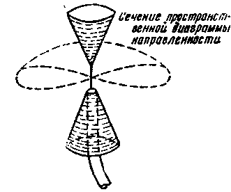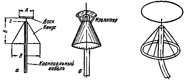 Для установления дальних радиосвязей в диапазонах 144- 146 Мгц и особенно на 420-425 Мгц необходимо сконцентрировать излучение электромагнитной энергии в виде узкого луча и направить его возможно ближе к горизонту. При этом также необходимо иметь возможность устанавливать радиосвязи с корреспондентами, находящимися в различных направлениях от радиостанции при неподвижной антенне. Для такого случая антенна должна иметь в вертикальной плоскости диаграмму направленности в виде вытянутой восьмерки, а в горизонтальной - в виде окружности. Подобную диаграмму можно получить при исполнении биконической антенны (рис. 2), представляющей собой два металлических конуса, к одному из которых присоединена средняя жила кабеля, а к другому - его оплетка. Недостатком такой антенны является необходимость симметричного возбуждения.