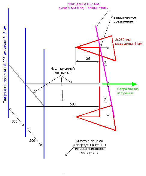 Описание нового типа антенны на диапазон 2м было опубликовано в "REF Radio" N 12/89 г. и N 1 /90 г. Авторы этой антенны — F6HLZ и FC1MZO считают, что их конструкция произведет революцию в коротковолновом мире. Авторскую идею охраняет французский патент, но авторы разрешили публикацию. ![]() Рис.1 Представляя четыре версии этой антенны, ограничимся короткими характеристиками и конструктивными особенностями. Версия N1. Образуют два равносторонних треугольника с размером стороны 250 мм. Треугольники расположены горизонтально, один над другим, на расстоянии 292 мм. Регулировка этого расстояния влияет на величину КСВ, а достигаемое усиление равно б дБ. Версия N2. Это модернизированная антенна версии N1, к которой добавлен так называемый "bat" (на рис.1 помечен и выделен). В этом случае усиление антенны доходит до 8 дБ. Версия N3. В антенну версии N2 добавлены два рефлектора. Усиление достигает 12 дБ. Версия N4. В антенну версии N2 добавлены три рефлектора. В этой версии усиление достигает 18 дБ. Отношение излучения вперед/назад — 20 дБ. Подавление боковых лепестков — 24 дБ. ![]() Рис.2 Другая оценка работоспособности этой антенны была сделана по сравнению показаний S-метра при одинаковом источнике сигнала. При антенне GP - S - 1, когда при антенне F6HLZ (версия 1) S - 3, (версия 2) S - 4, (версия 3) S - 4, (версия 4) S - 5. ![]() Рис.3 На рис.1 представлена антенна версии N 4. Для горизонтальной поляризации — представлена на рис.2. На рис.3 показано подключение кабеля к антенне, показанной на рис.1. Питающий кабель — 50 Ом. SP2FAV, "QTC"N3 1992г. Перевод с польского С.Попович (UC2LAQ).