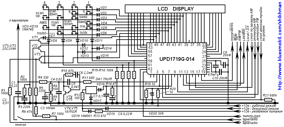 Синтезаторы частоты современных приемников выполнены по схеме с ФАПЧ (в англоязычной терминологии PLL - Phase Locked Loop). Принципы построения подобных систем известны: сигнал гетеродина после деления частоты сравнивается по частоте и фазе с опорным сигналом, частота которого равна шагу сетки частот в выбранном диапазоне. Полученный в результате сравнения сигнал ошибки изменяет частоту гетеродина таким образом, что она становится равна опорной частоте, умноженной на коэффициент деления. Быстродействие синтезаторов первого поколения было недостаточным, поэтому в диапазоне УКВ их использовали в комплекте с внешним делителем частоты. Набор функций был крайне ограничен. Синтезаторы второго поколения уже выполнены полностью на одной микросхеме. Они включают в себя управляющий микропроцессор и ячейки памяти настроек. Обычно используется по 5-6 ячеек памяти в каждом из диапазонов АМ и от 10 до 30 и более в диапазоне УКВ. Ячейки в диапазоне УКВ для удобства пользования обычно разбивают на группы. Для индикации частоты настройки в синтезаторах первого поколения использовались светодиодные индикаторы, затем перешли к использованию жидкокристаллических экранов (LCD display) с задней подсветкой и катодолюминисцентных индикаторов (в дорогих моделях). Изменение сетки частот (европейский или американский стандарт) ранее производилось внешними перемычками или переключателями на плате магнитолы, в новых моделях эта операция проводится с клавиатуры чисто программным путем. Помимо управления собственно частотой настройки приемника, микропроцессор синтезатора частоты выполняет и ряд сервисных функций. Алгоритм работы и наименование функций у разных производителей достаточно сильно отличаются. Обычный набор функций таков: переключение диапазонов (band), ручная настройка (manual tuning) с возможностью запоминания (memory), автоматическая настройка и запоминание всех доступных станций (auto tuning, auto memory store - AMS) или станций с максимальным уровнем сигнала (best stations memory, BSM), автоматическая настройка на следующую по частоте станцию (seek), сканирование ячеек памяти вперед (scan up) или назад (scan down) с прослушиванием в течение 5-10 секунд. Кроме того, автоматически запоминается последняя настройка на каждом из диапазонов (в приемниках с аналоговой настройкой это свойство было само собой разумеющимся). В функции микропроцессора входит также сканирование клавиатуры, индикация диапазона, частоты настройки, номеров ячеек памяти, режимов работы приемника или магнитофона, набор которых может довольно сильно отличаться от модели к модели даже среди продукции одной фирмы. С распространением в звуковом тракте цифровых регуляторов (громкость, баланс, тембр) управление ими было возложено на микрокомпьютер синтезатора частоты. Лентопротяжные механизмы с логическим управлением и ряд внешних устройств также обслуж иваются этим микропроцессором, что дает основание причислить подобные управляющие системы к третьему поколению. Появившиеся в последние годы системы передачи данных по радиоканалу (RDS) используют для вывода информации все тот же дисплей и микропроцессор. Предается дорожные сводки для водителей, прогноз погоды, финансовые новости и другая информация, которая может быть сохранена в памяти. Декодирование данных пока производится отдельным устройством, но можно пред