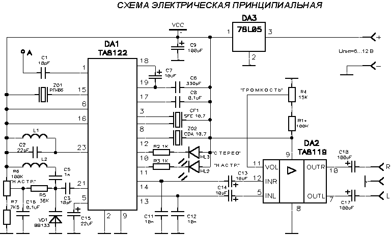 Отличается от аналогичных схем высокой чувствительностью (1мкВ), малым током потребления (20мА) и напряжением питания (6...12В), наличием электронной настройки и стерео УНЧ с электронной регулировкой громкости. Применение кварцевых резонаторов и фильтров существенно облегчает настройку приемника.