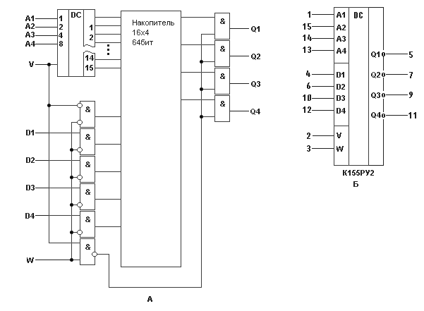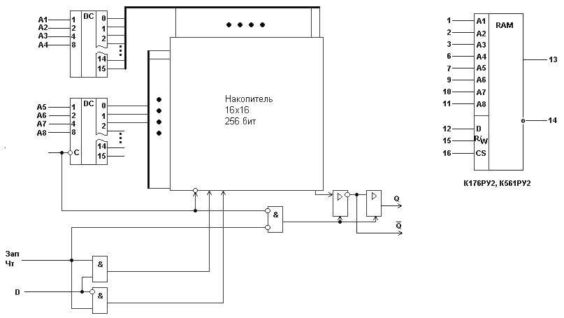 ОЗУ Микросхемы ОЗУ построена на биполярных и МДП транзисторах. Элементом памяти в первых из них служит простейший триггер, во вторых – триггер или конденсатор, заряжаемый до напряжения, соответствующего единичному состоянию элемента. Биполярные триггерные микросхемы обладают значительным быстродействием, а МДП микросхемы – большей емкостью ЗУ. Кроме того, МДП-микросхемы потребляют значительно меше энергии. Типичный пример триггерного ОЗУ – параллельный регистр;. При четырех битах хранимой информации все его компоненты умещаются в одном корпусе с 14-ю выводами, обеспечивающими доступ ко всем входам и выходам четырех элементов памяти. Организация памяти в виде отдельных регистров применяется при создании ОЗУ малой ёмкости.При увеличении емкости ОЗУ возникает проблема доступа к каждому элементу памяти при ограниченном числе выводов в корпусе. Эта задача решается с помощью адресной организации ЗУ с использование дешифратора кода адреса. Как уже говорилось ранее, дешифратор с n адресными входами дешифрирует 2n состояний. Таким образом, при четырёх входах можно организовать обращение к 16 элементам памяти при 10 к 1024 элементам. Запоминающее устройство адресного типа состоит из трех основных блоков: массива элементов памяти (накопитель), блока адресной выборки (дешифратор адреса) и блока управления.Рассмотрим назначение и взаимодействие этих блоков на примере ОЗУ на 64 бита с адресной организацией выборки 16 четырехразрядных слов (16 слов х 4 разряда = 64 бита). Условное изображение и функциональная схема такой микросхемы приведены на рисунке 1,а. Массив памяти образован 16 четырехразрядными цепочками триггеров. При сигнале V=0 одна из цепочек, соответствующая выставленному адресу А1—А4, переходит в рабочее состояние, и ее сигналы поступают на входы элемента И (7—10). При сигнале V-1 на всех выходах DС низкие уровни, и следовательно, все триггеры отключены от выходных шин накопителя. При V=0 и W=0 на выбранную цепочку поступают информационные сигналы входы (D0—D4) и элементом 1 вырабатывается сигнал записи. В этом режиме при смене информации на входе ОЗУ происходит перезапись информации в данном слове массива. При сигналах V=1 и W=0 входная информация проходит непосредственно на выход микросхемы, минуя массив триггере (дешифратор не выбирает ни одной из цепей). И, наконец, при V=1 и W=1 запрещена работа дешифратора, узла, вырабатывающего сигнал «Запись» и входных элементов И.![]() Рисунок 1 Выходные логические элементы И выполнены по схеме с открытым коллектором, что позволяет соединять вместе выходы Q нескольких микросхем ОЗУ. При этом происходит наращивание емкости ОЗУ две микросхемы—32 слова, три—48 и т. д.. Адресное управление А1—А4, информационные входы D1—D4 и выход Q1—Q4 всех микросхем объединяют в общие шины, а выбор рабочего массива осуществляют дополнительным дешифратором по входам V и W. Так построена микросхема К155РУ2 рисунок 1,б.![]() Рисунок 2 При конструировании ОЗУ ёмкостью в сотни тысяч бит в одном корпусе возникают трудности с созданием дешифраторов с таким числом выходов. Их удалось преодолеть при построении матричных накопителей, в которых выборка каждого элемента памяти осуществляется не по одной шине, а по двум (по строкам и столбцам). Функциональная схема такого ОЗУ емкостью 256 бит приведена на рисунке 2. Для выбора 256 ячеек необход