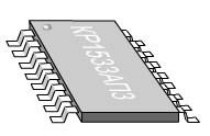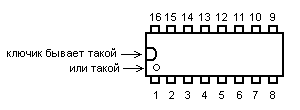 Обычный «тараканчик». Ножки просовываем в дырки на плате – и запаиваем. Ножек в корпусе может быть 8, 14, 16, 20, 24, 28, 32, 40, 48 или 56. Расстояние между выводами (шаг) – 2,5 мм (отечественный стандарт) или 2,54 мм (у буржуев). Ширина выводов около 0,5 мм Нумерация выводов – на рисунке (вид сверху). Чтобы определить нахождение первой ножки, нужно найти на корпусе «ключик». ![]() SOIC