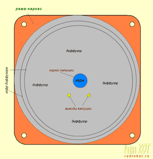 катушки (по постоянному току): Катушка чаще всего наматывается в два слоя обычным проводом в лаковой изоляции, но в особо мощных конструкциях провод может быть и прямоугольного сечения - для увеличения эффективного заполнения зазора. Катушка приклеивается к каркасу. При некачественной проклейке, или при перегрузке динамика часть витков может «болтаться» внутри и создавать звуковые эффекты, не относящиеся к категории высококачественного звуковоспроизведения. В прошлом веке радиолюбители самостоятельно перематывали звуковые катушки, тем более, что конструкция многих динамиков это позволяла. Центрирующая шайба – назначение понятно из названия. Главное - не создавать помех перемещению звуковой катушки, и быть воздухопроницаемой, иначе внутри магнитной системы,где находится катушка, образуется замкнутый объём. Но о его вреде мы вспомним дальше, когда будем рассматривать акустическое оформление громкоговорителей. Материал шайбы - что-то вроде пропитанной марли - для ширпотреба, и что угодно - для эксклюзива. Из-за повышенной влажности или других нехороших влияний может нарушаться центровка, дефект не устраним без разборки динамика. Проверить центровку можно,аккуратно нажимая на диффузор и прислушиваясь к звукам внутри- их быть не должно! Выводы катушки - выполняются спецпроводом «мишурой» из перемешанных тонких медных и шёлковых нитей. Выводы не должны мешать перемещению диффузора. Из-за постоянных перемещений имеют склонность к обрывам около контактных пятачков, где припаиваются к выводам звуковой катушки. Хорошей альтернативой является провод МГТФ со снятой изоляцией. Слишком длинные выводы могут тереться об диффузор и создавать интересные звуки, придающие неповторимый колорит звучанию вашей акустики, но не ценимые другими слушателями. Зазор – зазор между магнитной системой и керном, где перемещается звуковая катушка. Чем меньше зазор, тем выше в нём индуктивность, и тем выше эффективность работы динамика. Предпринимались неоднократные попытки увеличить индуктивность без увеличения зазора путём введения туда магнитной жидкости. Но это приводило к увеличению сопротивления перемещению диффузора и повышению нижней границы воспроизводимых частот. Попадание в зазор мусора чревато искажениями звука, поэтому зазор обычно закрывают колпачком (на рисунке отсутствует). Заодно колпачок улучшает воспроизведение верхних звуковых частот. Рама - она же каркас, она же диффузородержатель. В дешёвых конструкциях - из пластмассы, в ширпотребе - из штампованного листа, в более дорогих конструкциях - литьё из алюминиевых сплавов. Обычно в раме присутствуют «окна» для свободного перемещения воздуха, но в высокочастотных динамиках это не обязательно. Рама должна быть очень жёсткой, не резонировать, быть удобной при установке динамика в корпус и радовать взор счастливого обладателя девайса. О характеристиках,непосредственно влияющих на звук, расскажем в следующей статье. Мы рассмотрели общие вопросы конструкции динамиков, теперь рассмотрим некоторые экзотические конструкции. Форма диффузора динамика - правильный круг, как самый технологичный элемент. Эллиптические формы - только для уменьшения габаритов, и не имеют каких-либо достоинств. А японцы сподобились сделать даже квадратный, который очень красиво вписывается в 