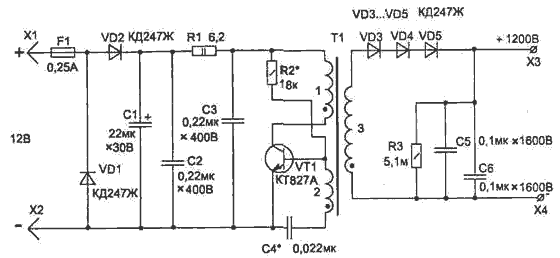 трансформаторе Т1, с высоковольтной обмотки которого после выпрямления на диодах