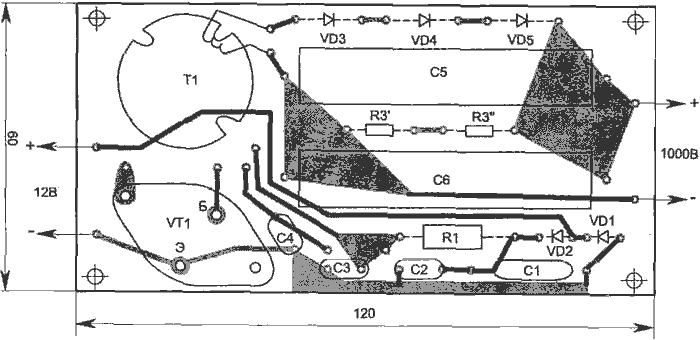 опасности для жизни, однако второй раз его получать уже не захотелось. Для изготовления схемы потребуется намотать трансформатор Т1 на диэлектрическом каркасе, вставляемом в броневой сердечник БЗО из феррита М2000НМ1 (М1500НМ1). Трансформатор содержит в обмотке 1 — 9 витков, 2 — 10 витков провода ПЭЛШО-0,18, в обмотке 3 — 1800 витков провода ПЭЛ-0,1. Его изготовление требует аккуратности, и при намотке 3-й обмотки необходимо через каждые 400 витков укладывать конденсаторную диэлектрическую бумагу (ее можно достать из высоковольтного конденсатора), а слои пропитать конденсаторным или трансформаторным маслом. После намотки катушки вставляем ее в ферритовые чашки и склеиваем (предварительно убедившись, что она работает). Места выводов катушки заливаются разогретым парафином. При сборке схемы необходимо соблюдать полярность фаз обмоток трансформатора, указанную на схеме. Топология печатной платы и расположение на ней элементов (кроме предохранителя) приведены здесь ниже. Трансформатор крепится к плате клеем. Питается схема от аккумулятора или любого источника с напряжением 10...15 В.