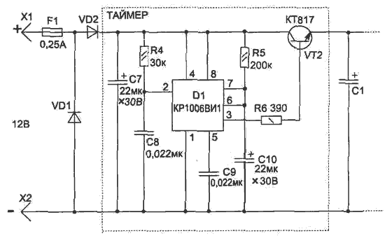 Таймер позволяет при подаче на схему напряжения включать ее на 5...15 секунд (время зависит от величины номинала конденсатора С10 и резистора R5), после чего он ее обесточивает до момента повторного включения питания. В схемах применены конденсаторы С1, С7, С10 типа К53-4; С2, СЗ, С4, С8, С9 — К73-9 на 100 В ; С5, С6 — К42У-2 или К73-16В на 1600 В.