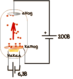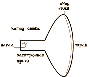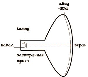 понятно. Я прекрасно понимаю, что в наш век плазмы и жидкого кристалла, электронно-лучевой кинескоп кажется кому-то пережитком старины. Однако, понять принцип работы телевизора, проще всего именно разбираясь с ЭЛТ. Электронно-лучевая трубка Шо це таке. Причем здесь электроны? Причем здесь лучи? Дело в том, что картинка на экране рисуется при помощи электронного луча. Электронный луч очень похож на световой. Но световой луч состоит из фотонов, а электронный - из электронов, и мы его увидеть не можем. Куча электронов несется с бешеной скоростью по прямой от пункта А - к пункту Б. Так образуется "луч". Пункт Б - это анод. Он находится прямо на обратной стороне экрана. Также, экран (с обратной стороны) вымазан специальным веществом - люминофором. При столкновении электрона на бешеной скорости с люминофором, последний испускает видимый свет. Чем быстрее летел электрон до столкновения - тем свет будет ярче. То есть, люминофор - это преобразователь "света" электронного луча в свет, видимый для человеческого глаза. С пунктом Б разобрались. А что же такое пункт "А"? А - это "электронная пушка". Название страшное. Но страшного в ней ничего нет. Она не предназначена для того, чтобы жестоко расстреливать пришельцев с Марса. Но "стрелять" она все же умеет - электронным лучем в экран. Как это все устроено? Вообще, ЭЛТ - это такая большая электронная лампа. Как? Вы не знаете что такое лампа? Ну ладно… Электронные лампы - это такие же усилительные элементы как и любимые всеми нами транзисторы. Но лампы появились намного раньше их кремниевых "коллег", еще в первой половине прошлого века.