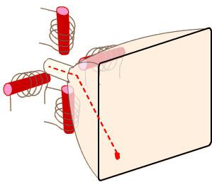 Итак, луч получили. И он так красивенько светит аккурат в центр экрана. Но нам-то надо, чтоб он "чертил" по экрану линии. То есть, нужно заставить его отклоняться от центра. И в этом мам помогут… электромагниты. Дело в том, что электронный луч, в отличие от светового, очень чувствителен к магнитному полю. Поэтому то он и используется в ЭЛТ.