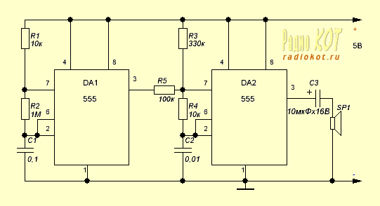 Транзистор можно заменить на отечественный КТ3107. Схема 10: Твухтональная сирена. Занятная схема для экспериментов с включением двух таймеров сразу. Источник: www.radiokot.ru