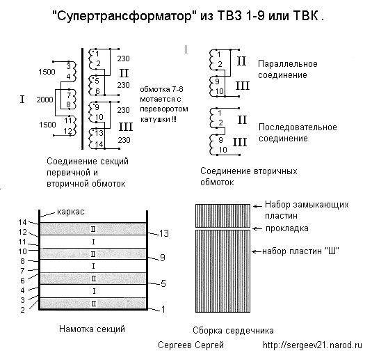 Мой вариант: 3 секции первички: 1500+2000+1500=5000 витков проводом 0,08мм.