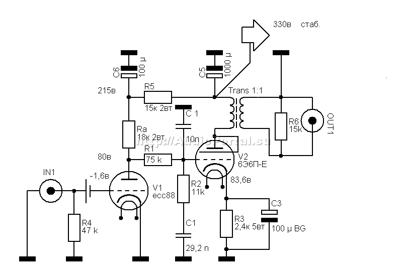 Входной каскад собран на всеми критикуемой лампе ЕСС88 от Теслы. Почему на ней? Ну есть они у меня около полусотни штук, куда-то девать их надо? А если серьёзно, то только эта лампа способна работать в данной схеме, при таком низком анодном напряжении и таких неслабых токах. К тому же тесловские ЕСС88 обладают очень приятным «породистым» звучанием, схожим отчасти с телефункеновским, и намного лучше тех же ламп от «Philips». Резистор в аноде первой лампы будет определять характер звука корректора в целом, поэтому ставьте то, что считаете самым лучшим для вас: ВС, УЛИ, БЛП, ПТМН, С2-10, а может быть и Рикен Ом или Аллен Брэдли. Сосредоточенная цепь коррекции очень проста : резисторы ПТМН с отклонением 0,5% на 75 ком и 11 ком, а также пара конденсаторов – КСО 10 000 пикофарад и КБГ-И 0,03 мкф на 600 в. Все детали подберите как можно точнее. Я подбирал с отклонением не более 0,05%. Вместо КБГ-И вы можете попробовать и другие типы конденсаторов: ФТ, МПГЦ, К70, К78 и пр. Но мне больше всего нравится именно указанное мной сочетание КСО и КБГ-И. Второй каскад собран на лампе 6Э6П-Е. Она работает в этой схеме с предельной мощностью анода – 8,4 вт при токе 35 ма. Не пугайтесь! Это крепкие лампы, они вытерпят и не такие режимы! Резистор в катоде 6Э6П – ВС-5. Он хоть и большой, но хороший. Если вы захотите поставить что-нибудь менее габаритное (скажем, МТ), имейте в виду: вам придётся хотя бы вдвое увеличить номинальную мощность резисторов (не пять, а, соответственно, десять ватт), иначе сопротивление будет слишком сильно греться. Окажите должное внимание конденсатору, шунтирующему катодный резистор. Это может быть Black Gate, Elna или ,если место позволяет, три штуки МБГО по 30 мк на 160 вольт. Выходной трансформатор – уже известный нам вариант №7 из статьи про «Выходные трансформаторы из подручных средств». Намотан на железе от ОСМ-0,1 (ШЛ 25 х 40), обе обмотки содержат по 2394 витка провода ПЭВ-2 диаметром 0,25 мм. Транс помещён в стальной кожух с толщиной стенки 1 мм. Если хотите, можете залить его, например, парафином. Я, однако, не делаю ничего подобного, поскольку грамотно собранные трансформаторы и так не вибрируют. Теперь о грустном. Усиление корректора невелико. Первый каскад усиливает сигнал на 28 дб, второй – на 31 дб. Однако вспомним про цепь коррекции и отминусуем 23 дб. В итоге получим усиление 36 дб. Что означает усиление сигнала всего-то в 63 раза. Однако мне этого вполне хватает: при 5 мВ на входе получим 315 мВ на выходе. Затем – никто не забыл? - мой предварительный усилитель на трёх деталях в три раза усиливает сигнал, а далее почти один вольт идёт на вход усилителя. Вот такая арифметика. Немного о правильном питании. Конечно, анодное напряжение требует стабилизации. И здесь идеальным решением будет параллельный , несколько худшим – последовательный стабилизатор. Выбор схемы стабилизатора – за вами. Моё мнение: чем проще – тем лучше. Лишь бы детали были бескомпромиссные. Трансформатор питания – ТС180, намотанный с ОЧЕНЬ сниженной рабочей индукцией. 2200 витков в первичке – не чрезмерно много. Экран после первичной обмотки обязателен. Накалы ламп также требуется стабилизировать (иначе нет смысла стабилизировать анодное напряжение). Здесь подойдут простейшие трёхвыводные КРЕНки – в цепи сигнала они не стоят. Потенциал накала первой лампы нулевой, второй – плюс сто вольт. Блок питания помещается в сталь