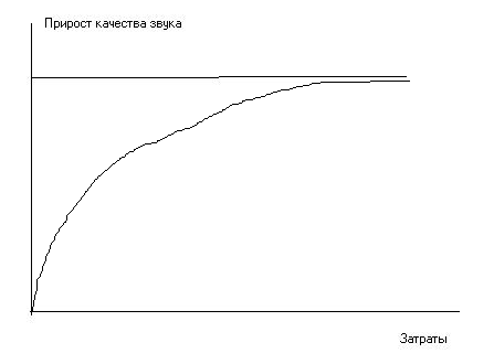 Все началось как у многих. Блуждая по степям интернета, наткнулся на сайт Брусникина и захотелось починить старый “Фестиваль”, покрытый вековой пылью. Послушав звук, подумал, что не так все плохо и продолжил свои опыты с лампами. Поскольку еще во времена моей учебы в МИФИ был затронут курс по ламповой технике (хотя я уверен, что это осталось), вспоминать было не так сложно. Моим первенцем год назад стал “ Бюджетный Лофтин-Уайт” от Брусникина из тех радиодеталей, что были под рукой. Меня просто потряс звук, хотя на том этапе я еще не догадывался, что такое НАСТОЯЩИЙ звук, да и сейчас понимаю, что пока не достиг совершенства. Изучая литературу по HI-END-тематике, пробовал на звук разные лампы и схемы. Ни одна вновь собранная схема по звуку не повторяла предыдущую! Чем дальше я совершенствовался, тем больше появлялось звучащих компонентов на моем рабочем столе. Были опробованы лампы: 6П3С, ГУ-50, 6П45С, ЕL-34, Г-807 и в качестве драйвера : 6Н8С, 6Н9С, 6Н7С, 6Н1П, 6Н2П, 6Н3П, 6Н23П и т.д., не говоря о конденсаторах и резисторах, серебре, меди и даже золоте! Все лампы при грамотно подобранном режиме (с учетом их собственной ВАХ и качества) - звучат! Я полностью согласен с утверждением патриархов HI-END “В усилителе ВАЖНО ВСЕ!”, от пайки и компоновки радиоэлементов до качества самих элементов! Но когда-то надо остановиться. (Сейчас я понимаю, что остановиться просто невозможно!) Стал понимать, что дальнейшее совершенствование в одиночку становится дорогим. Поэтому предложенные А.Манаковым схемы для тех, кто хочет только слушать музыку, – идеальное решение с точки зрения бюджета, да и схемотехника с изюминкой! Ну так вот, чтобы не потерять мысль, привожу очевидный график функции затрат на радиоэлементы от прироста качества. Всем понятно, что на заключительном этапе отладки достаточно большие вложения денег дают мизерный прирост качества звука!