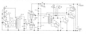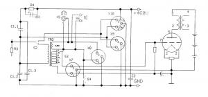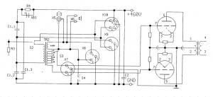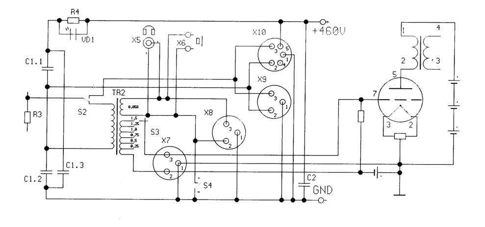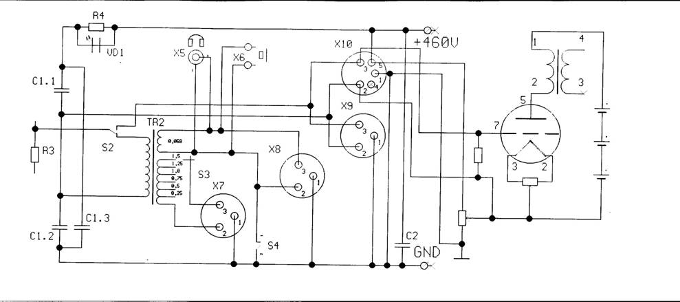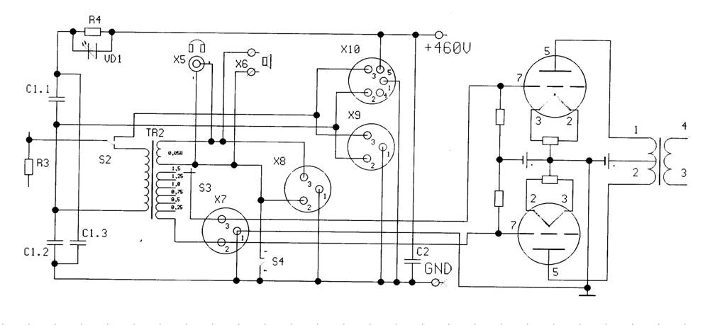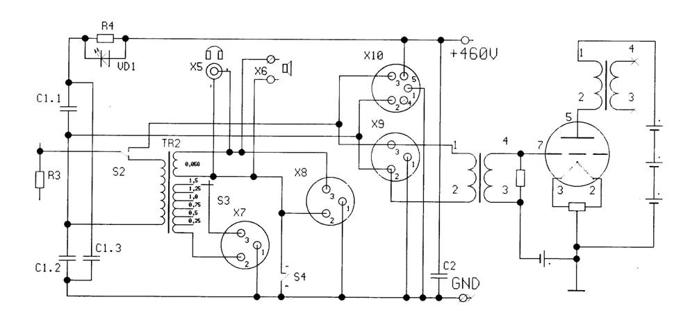 ;R4-подбирается по свечению VD1 при токе 30ма С разъема X1 сигнал поступает минуя входной трансформатор,сделано это для случая когда нагрузка имеет сравнительно высокоомный выход (следовало-бы выбрать сопротивления R1 и R2 побольше,просто моей аппаратуре и такие значения вполне подходят). X2,X3 подключаються через входной трансформатор по небалансной схеме а X4-по балансной.Входной трансформатор намотан на тороидальном сердечнике из пермаллоя,вторичная обмотка имеет 15 отводов через 3дБ и переключается герконовыми реле(схема управления не показана). Глубина регулировки невелика но резистором R2 можно выбрать нужный уровень более точно. Собственно усилитель собран по схеме SRPP на триодах 6С45П(6С15П),можно применить и 6С3П.Очень хорошо показали себя 6Э5П в триодном включении но выходное сопротивление выше , а коэффициент усиления у них меньше. Усилитель нагружен на трансформатор с двумя выходными обмотками: первая обеспечивае коэффициент трансформации 0,058 и предназначена для работы с оконечными усилителями с чувствительностью 2-3В ,а так-же для работы на наушники и акустические системы обеспечивая на нагрузке 6-8 Ом выходную мощность 1,2Вт. Вторая обмотка является выходом драйвера и обеспечивает коэффициент трансформации 1,5 , имеет переключаемые отводы для лучшего согласовния с выходным каскадом. Разъемы X9 иX10 соеденены с выходом SRPP каскада через переключатель S2,назначение их поясняется ниже. Светодиод VD1 светится при токе потребляемом каскадом более 30мА и сигнализирует о том что напряжение батарейки смещения упало ниже нормы 2,8В. Для питания усилителя используется стабилизированный источник с напряжением 460В. Источники питания рздельные для правого и левого канала. Авторский вариант имеет также поканальные стабилизированные источники смещения –150В и два источника выпрямленного напряжения 6,5В для накала выходных ламп.Например к нему может быть подключен оконечный каскад усилителя на 300В. Примеры использования предусилителя в качестве драйвера .