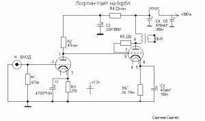 Так получилось, что увлечение ламповыми усилителями я начал с относительно мощных (10-15 ватт). Это было продиктовано низкой чувствительностью моих колонок на динамиках PEERLES, которые прекрасно звучали с транзисторным усилителем 50 ватт. Сначала были различные переделки прибоя от 12 до 20 ватт. В том числе на 6п36с. Потом я сделал однотактник на 6п45с. 10ватт. Слушаю до сих пор. Пообщавшись в форуме Аудио Портал, я решил попробовать на вкус (слух) 6ф5п. Собрал по схеме В.Пронина c ТВЗ-1-9 и был поражен. Оказывается даже с такими низкочувствительными колонками (87 дб) громкости для спокойного прослушивания достаточно. А если использовать акустику чувствительностью 95 дб и более, то мощнее и не нужно. Эта схема не претендует на хайэнд, но для начинающих лучше не придумаешь. Всего одна лампа, трансформаторы можно использовать от ламповых радиол или телевизоров. Далее переделал схему в Лофтин-Уайт. Мне показалось что усилок стал мощнее. Видимо просто больше коэфф. усиления. Можно пойти дальше и поставить в