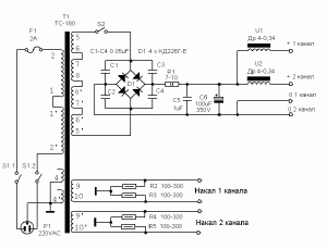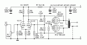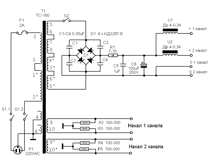 Выполнен на доступных лампах с выходным трансформатором ТВЗ-1-6 от лампового Ч/Б ТВ первого класса, или любого лампового радиоприёмника с РР выходным каскадом. Первый каскад - самобалансирущийся фазоинвертор, второй - двухтактный выходной каскад с автосмещением. Первый каскад настраивается подбором катодного резистора R4 по падению напряжения на нём порядка 1,5В. Второй каскад настраивается по току 40-45 мА каждой выходной лампы катодным резистором R10. При применении ламп 6П18П, 6П43П желательно ставить два одинаковых резистора 2Вт параллельно или последовательно для увеличения мощности, рассеиваемой на них. Выходные лампы желательно подобрать с одинаковыми параметрами, для этого последовательно с катодным резистором R10 на катод каждой лампы подключить резистор 1 Ом, и по падению напряжения на нём осуществить подбор ламп, близких по току и ток катода в пределах 40-45мА при падении напряжения на этом резисторе 0,04 – 0,045В. По переменному напряжению усилитель не требует настройки при исправных деталях и правильном монтаже. Резисторы – МЛТ, конденсаторы С2, С3 - К71-7, К78-2, электролитические – К50-32 с блоков питания ТВ 3УСЦТ, можно применить и других типов, например К50-7. Шунтирующие электролиты - конденсаторы К78, К73, К77 от 1мкФ. Блок питания выполнен на ТС-180, диодах КД226, для уменьшения фона при применении выходных лампам с разными токами анода установлены дроссели, если лампы подобраны, то можно обойтись без дросселей.