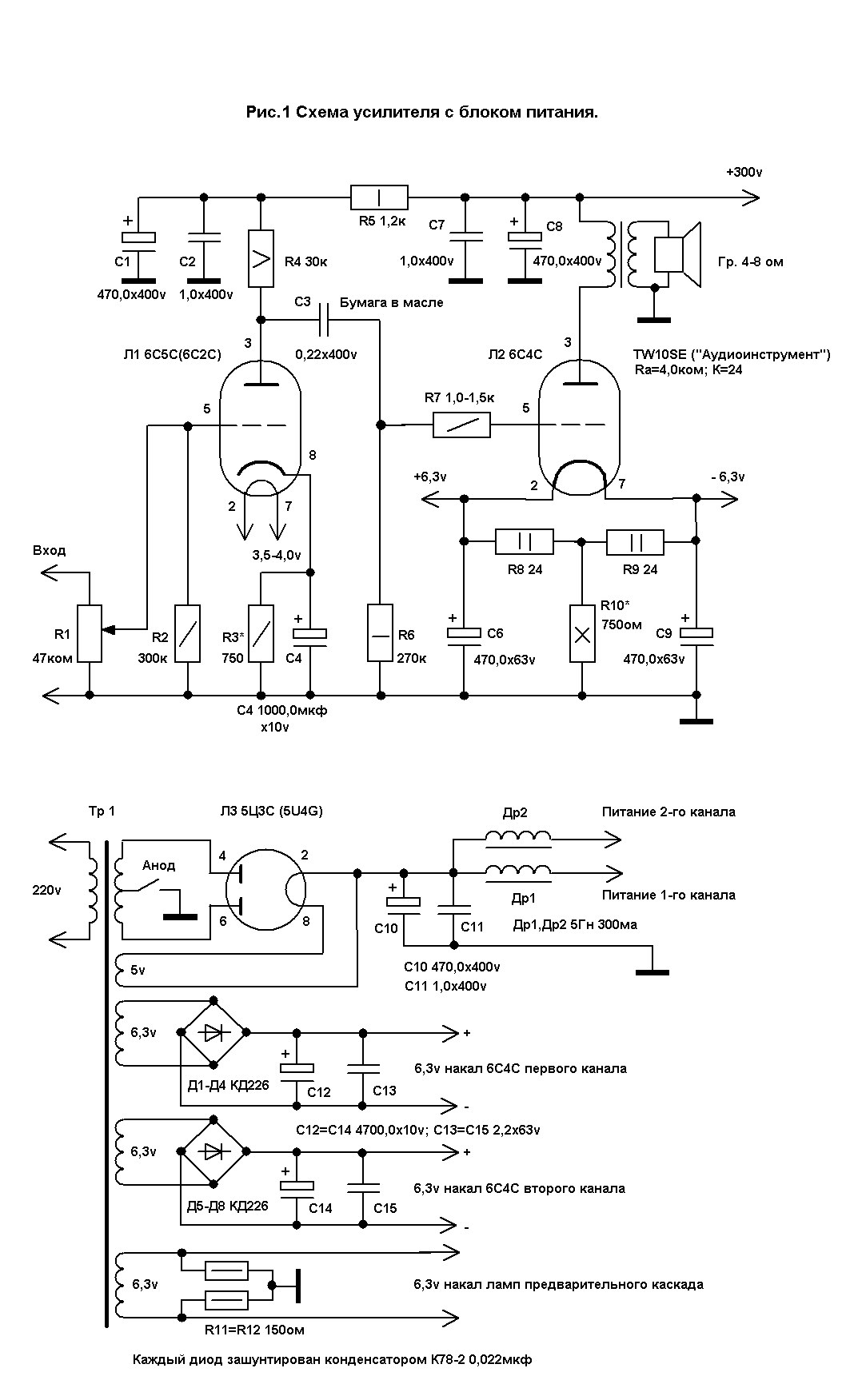 усилителя, в выходном каскаде которого работает триод косвенного накала. Я