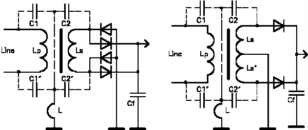 Из рисунка 4 понятно, что паразитная проходная емкость уменьшится за счет разбиения ее на две последовательно соединенные емкости, токи помех будут замыкаться через экран на корпус устройства. Однако, на высоких частотах за счет увеличения импеданса заземления L эффективность экрана будет падать. Вы можете спросить, какое нам дело до высоких частот? Дело в том, что это приводит к возникновению мультипликативной помехи, вызывающей повышение уровня фона, который невозможно подавить фильтрацией напряжений питания или экранированием входных каскадов усилителя, также эта помеха может нарушить работоспособность других устройств, подключенных к усилителю. Особенно сильно эта помеха может повлиять на тьюнер. Кратко, механизм возникновения помехи объясняется следующим эффектом. Время проводимости диодов при работе на фильтр, начинающийся с емкости, равна приблизительно трети полупериода сетевого напряжения. Значит, корпус усилителя с удвоенной частотой сетевого напряжения будет подключаться через проходную емкость трансформатора к сетевым проводам. Кроме того, в разных полупериодах величина этой емкости будет различна, потому что С1+С2 Если теперь рассмотреть входные цепи усилителя с подключенными соединительными проводами, как антенну, то становится понятно, что эффективность этой антенны будет изменяться синхронно с работой выпрямителя. Это приводит к перемножению спектров паразитного высокочастотного сигнала со спектром пульсирующего выпрямленного напряжения, которое, детектируясь на малых нелинейностях входных цепей, вызывает появление фона. Существует простой способ устранения такой помехи, который я опишу ниже, но кардинальным решением будет использование выпрямителя со средней точкой (рисунок 5). Такая схема при правильной конструкции трансформатора, то есть если обеспечена симметрия обмоток по активному сопротивлению (это важно для симметричного перемагничивания сердечника) и паразитным емкостям, обеспечивает отличное подавление синфазных сетевых помех и постоянную величину паразитной емкости между корпусом устройства и сетевыми проводами. Я считаю, что для High-End аудио аппаратуры целесообразно обмотки накала также выполнять симметричными с отводом от средней точки, тем более что при использовании ламп прямого накала это обязательное требование.