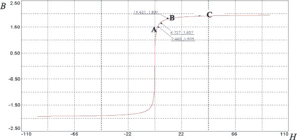 где l– средняя длина магнитной силовой линии сердечника. Как известно, для ферромагнитных материалов зависимость индукции B от напряженности поля H имеет нелинейный характер, для упомянутой выше стали 3412 модель кривой намагничивания имеет вид: