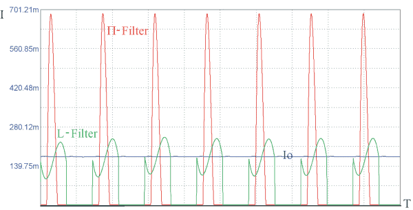 Наиболее часто используют Π - фильтр, это объясняется следующими причинами: Во-первых, необходимое напряжение Us на вторичных обмотках трансформатора при заданном выходном напряжении Uo, как правило получается меньше (это справедливо при значении Uo ~ 300 ÷ 400 V и токах нагрузки Io~ 50 ÷ 300 mA). Во-вторых, фильтрующие свойства Π - фильтра лучше и необходимые значения элементов при заданном коэффициенте пульсаций будут меньше. В третьих, перенапряжения, возникающие на элементах фильтра при включении питания и скачках нагрузки меньше. Но у него есть существенный недостаток – импульсный характер потребления тока от выпрямителя. Импульсы тока имеют значительную амплитуду, превышающую выпрямленный ток в несколько раз, и широкий спектр.