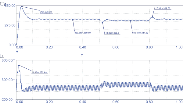 где FL – нижняя рабочая частота усилителя. Как видно из рисунка 14, ток звуковой частоты протекает через выходную емкость источника питания, что требует применения линейных емкостей высокого качества (например, бумажных). Поэтому, выбор оптимальной величины этой емкости существенно влияет на стоимость источника питания. Выбор величины выходной емкости источника питания для двухтактных схем имеет ряд отличий. В двухтактной схеме при идеальной симметрии половин выходного каскада через источник питания протекают только токи четных гармоник и общий постоянный ток выходных ламп, поэтому коэффициент частотных искажений не задается. Это свойство двухтактных каскадов позволяет использовать для выходной емкости фильтра электролитические, высококачественные конденсаторы. Не следует забывать, что в реальных устройствах ассиметрия может достигать 10 ÷ 15 % (даже при подобранных лампах), и часть тока звуковой частоты будет протекать через источник питания. Переходные процессы, возникающие в фильтре при включении источника питания и резких изменениях тока нагрузки, могут привести к перенапряжениям на элементах фильтра и схемы, а также к возникновению экстратоков через выпрямительные диоды. Особенно это характерно для L – фильтров. На рисунке 15 показаны временные диаграммы напряженния на выходе фильтра и тока через дроссель (рисунок 10). Из них видно, что включение источника приводит к кратковременному возрастанию напряжения на выходе выпрямителя на 60 % и броску тока через дроссель, достигающего 0.67А, что может быть опасным для используемых компонентов. На этом же рисунке показана реакция фильтра на скачкообразное изменение (50%) потребляемого тока. Кроме того, что изменение тока нагрузки приводит к провалу и выбросу напряжения на выходе источника питания, переходной процесс носит колебательный характер.