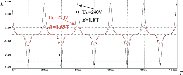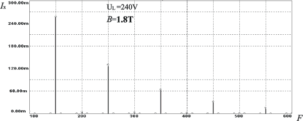 Из кривой намагничивания видно, что величина Еще одним отрицательным фактором выбора индукции, близкой к предельной, является повышенная величина поля рассеяния трансформатора. Значение относительной магнитной проницаемости материала -µ отражает его способность концентрировать в себе магнитное поле. При сильных полях величина µ падает, и значительная часть магнитных силовых линий начинает замыкаться не через сердечник, а по воздуху. Особенно опасно выбирать рабочие значения индукции в сердечнике близко к резкому изгибу кривой намагничивания. Незначительное повышение напряжения питания или незначительная асимметрия выпрямителя и обмоток приведет (асимметрия выпрямителя и обмоток приводит к появлению постоянной составляющей в токах и перемагничиванию сердечника по смещенной, частной петле намагничивания) к существенному изменению режима трансформатора. Поэтому использование рекомендованного значения индукции 1.55 ÷ 1.65 Т может приводить к нежелательным эффектам, описанным выше. На рисунке 2 показано, как изменится ток намагничивания трансформатора мощностью 180 Ватт с сердечником из стали 3412 при повышении напряжения питания на 10%, а на рисунке 3 - его спектр при повышенном напряжении.