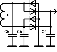 где Z – импеданс источника питания. Удовлетворительные результаты получаются, если значение KF = 0.97 ÷ 0.99 [6]. Если учесть, что импеданс дросселя L практически всегда существенно больше импеданса емкости C, то, опустив промежуточные преобразования, необходимое значение емкости можно определить по формуле: