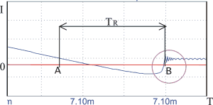 3.2. Выпрямительные диодыВ настоящее время, в качестве выпрямительных диодов используют твердотельные устройства, они характеризуются малыми габаритами, малым падением напряжения и высокой надежностью. Но во многих публикациях отмечалось, что усилитель, снабженный выпрямителем на твердотельных диодах, звучит хуже, чем этот же усилитель с выпрямителем на вакуумных диодах. Одной из причин этого является возникновение высокочастотных колебаний с широким спектром во время процесса запирания диода при смене на нем полярности приложенного напряжения. Упрощенно, не углубляясь в физику работы полупроводникового диода (процессы коммутации диодом тока весьма сложны), механизм возникновения помех объясняется протеканием через диод обратного тока и резким его прерыванием в момент запирания. На рисунке 7 показана временная диаграмма тока, текущего через диод при его запирании. При протекании через диод прямого тока (диод открыт) в области базы происходит накопление избыточных зарядов. По мере уменьшения разности потенциалов на выводах диода ток через него уменьшается и в точке А становится равным нулю. Но диод еще не заперся, и при смене полярности на его электродах через диод будет протекать реверсный ток, рассасывающий избыточный заряд в области базы, падение напряжения на диоде приблизительно равно прямому падению. Когда базовый заряд станет равным нулю, прямое напряжение на диоде резко изменяется на обратное. Этот момент запирания диода соответствует точке В на диаграмме. Как видно из диаграммы, процесс установления обратного сопротивления происходит очень быстро (~0.3 µS) и сопровождается прерыванием тока, что и вызывает возникновение паразитных колебаний.