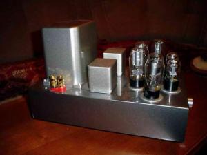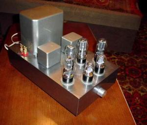 Схема особенностей не имеет, обычный самобалансирующийся драйвер, выполненный на лампе 6Н9С, и двухтактный выходной каскад на лампах 6Ф6С. Выходные трансформаторы использовались от стерео радиолы”Симфония”. На фото видны дросселя со старых военных переговорных ламповых устройств. Дроссель закрыт латунным кожухом и заполнен газом, умели же делать. Наверху чётко видны бугорки от пайки. Схема. Фото 1. Фото 2.