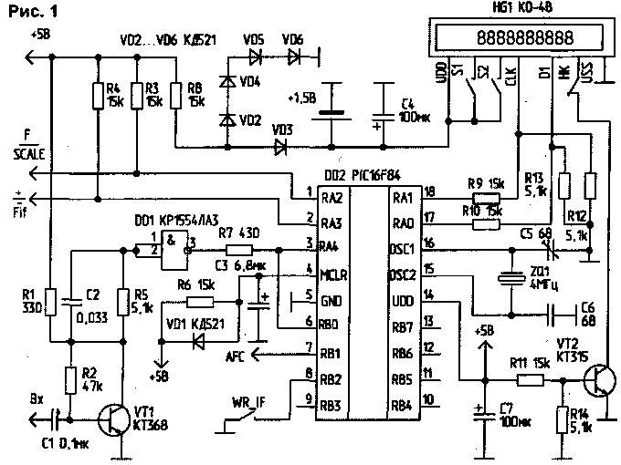 Устройство выполняет следующие функции: - частотомера с выводом измеренного значения частоты в герцах (до 8 разрядов); - цифровой шкалы с АПЧ генератора плавного диапазона (ГПД) для радиолюбительского трансивера; - электронных часов. Основу устройства составляет программируемый контроллер PIC16F84 фирмы MICROCHIP. Большое быстродействие и широкие функциональные возможности этого контроллера позволяют подавать сигнал частотой до 50 МГц прямо на его счетный вход, т.е. можно обойтись без предварительного делителя, обычно применяемого в устройствах подобного типа.