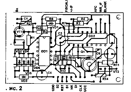 Система АПЧ ГПД работает следующим образом. После измерения частоты входного сигнала производится анализ числа равного сотням герц и, если оно четное, на вывод 8 микросхемы DD2 выдается уровень логического "О"; если нечетное, на вывод 8 микросхемы DD2 выдается уровень логической "1". Эти логические сигналы, предварительно проинтегрировав, можно использовать для управления емкостью варикапа в контуре ГПД. В результате осуществляется стабилизация частоты возле четных значений сотен герц с точностью ±10 Гц. В режиме цифровой шкалы можно осуществить гашение десятков и единиц герц, если установить уровень логического "О" на выводе 9 микросхемы DD2. Для перевода устройства в режим электронных часов необходимо нажать кнопку "НК". Для корректировки часов и минут служат кнопки "S1" и "S2". Печатная плата устройства приведена на рис.2. Скачать прошивку и исходный код (113 кБайт) С.САПОТЬКО (EW2AH), г.Молодечно.