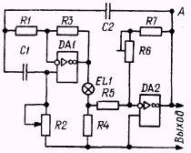 Упрощенная принципиальная схема генератора изображена на рис. 1. На ОУ DA1 и элементах R1 — R3, С1 собран широко применяемый и описанный в литературе регулируемый фазовращатель, вносящий сдвиг фазы сигнала, который определяется отношением емкости конденсатора С1 и сопротивления резистора R1. С выхода фазовращателя сигнал поступает на цепь стабилизации амплитуды EL1R4, компенсирующую влияние таких дестабилизирующих факторов, как температура и неидеальность параметров ОУ. На ОУ DA2 и резисторах R5 — R7 выполнен обычный инвертирующий усилитель. Вносимый им сдвиг фазы постоянен и равен 180° . Подстроечный резистор R6 служит для установки требуемого уровня выходного сигнала. Конденсатор С2 с входным сопротивлением каскада на ОУ DA1 образует цепь, дополнительно сдвигающую фазу сигнала на угол, который в сумме со сдвигом фазы, вносимым этим каскадом, составляет 180°. Таким образом выполняется одно из условий возникновения генерации — баланс фаз. Полная принципиальная схема генератора показана на рис.2