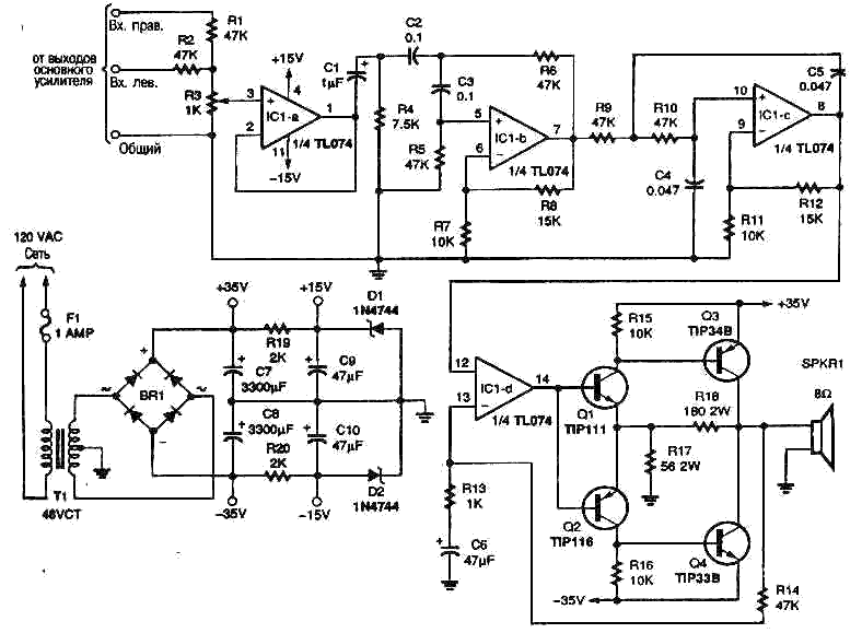 Источник питания состоит из трансформатора на 48 В со средней точкой, мостового выпрямителя и конденсаторов фильтров. Выпрямленное и отфильтрованное выходное напряжение составляет около ±35 В. Напряжения питания для операционного усилителя IC1 стабилизируются на уровне ±15 В стабилитронами D1, D2 и резисторами R19, R20. Входная цепь состоит из микшера и делителя напряжения, образуемых резисторами R1 и R2, потенциометром R3 и буферным повторителем на микросхеме IC1-а. Потенциометр R3 предназначен для установки выходного сигнала субнизкочастотного громкоговорителя на желаемый уровень. На операционном усилителе ICl-b, конденсаторах С2, СЗ и резисторах R5, R6 собран фильтр высоких частот с крутизной 12 дБ на октаву. Частота среза этого фильтра составит l/2pRC (около 34 Гц при указанных номиналах). Резисторы R8 и R7 определяют усиление и добротность фильтра. Конденсатор С1 и резистор R4 составляют дополнительный фильтр ВЧ с крутизной 6 дБ на октаву и частотой среза примерно 20 Гц. На операционном усилителе 1C 1-е, конденсаторах С4, С5 и резисторах R9, R10 собран фильтр низких частот с крутизной 12 дБ на октаву. Приведенные на рисунке номиналы определяют частоту среза 72 Гц. Усиление и добротность этого каскада определяются резисторами R11 и R12. Два вышеописанных фильтра, включенные последовательно, образуют полосовой фильтр. При работе от напряжения питания ±15 В выходное напряжение операционного усилителя ICl-d может достигать 10 В для управления транзисторами Q1 и Q2. Резисторы R17 и R18 образуют цепь местной отрицательной обратной связи и определяют усиление выходного каскада, равное примерно 3. Таким образом, пики выходного напряжения могут достигать 30 В. Если используются супербета-транзисторы указанного типа, то пиковая выходная мощность на нагрузке 8 Ом составит 30 х 30 / 8 = 112,5 Вт. Общий коэффициент усиления определяется резистором R13 и резистором общей обратной связи R14.