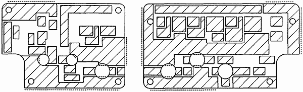 Усилитель содержит Г-образный аттенюатор на p-i-n диодах VD1 и VD2, 6 каскадов усиления на транзисторах VT1, VT2, VT4, VT6, VT8, VT10 и датчик уровня выходного напряжения на диоде VD3. Аттенюатор изменяет уровень сигнала на входе усилительных каскадов, регулируя тем самым коэффициент усиления. При перемещении движка резистора R1 в крайнее левое (по схеме) положение, напряжение на диоде VD1 становится равным нулю, и его сопротивление — максимально. В это время напряжение на диоде VD2 — максимально, а его сопротивление — минимально. В этом случае коэффициент передачи усилителя максимален. При перемещении движка R1 вправо коэффициент усиления плавно уменьшается. В процессе регулировки усиления происходит небольшое изменение наклона АЧХ усилителя, однако в диапазоне регулировки (34 дБ) ее неравномерность не превышает ±1,5 дБ. В первом усилительном каскаде на транзисторе VT1 используется параллельная обратная связь по напряжению через резистор R2, уменьшающая входное сопротивление каскада и обеспечивающая тем самым увеличение глубины электронной регулировки усиления. Во втором каскаде использована корректирующая цепь первого порядка C1-R15. Требуемый режим работы первых двух каскадов (ток покоя - 5 мА) устанавливается подбором резисторов R3 и R4. В остальных каскадах на транзисторах VT4, VT6, VT8, VT10 применена активная коллекторная термостабилизация [1]. Токи покоя указанных транзисторов выбираются равными 50 мА (для VT4 и VT6), 400 мА (для VT8 и VT10), и устанавливаются они подбором резисторов R5...R8. Требуемая полоса пропускания в каскадах на транзисторах VT4, VT6 и VT8 достигается благодаря использованию реактивных межкаскадных корректирующих цепей третьего порядка [2]. Выходной каскад выполнен по схеме со сложением напряжений [3] и обеспечивает суммирование на нагрузке сигнальных напряжений, отдаваемых транзисторами VT8 и VT10. Печатная плата усилителя (рис.2) состоит из двух частей размерами 65x45 мм и 82x45 мм. Она изготавливается из двустороннего фольгированного стеклотекстолита толщиной 1,5...2 мм. Пунктирной линией на рис.2 обозначены места металлизации торцов платы, что можно также сделать с помощью металлической фольги, которая припаивается к нижней и верхней частям платы. Металлизация необходима для устранения паразитных резонансов и заземления нужных участков печатной платы. После металлизации торцов с помощью напильника выравнивается нижняя часть платы, и она устанавливается в корпус.