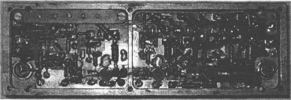 Рис.2. Печатная плата усилителя Настройка усилителя состоит из нескольких этапов. Вначале производится покаскадная настройка АЧХ усилителя. Для этого с помощью резисторов R3...R8 устанавливаются токи покоя транзисторов. Затем в качестве нагрузки VT1 через разделительный конденсатор подключается резистор 50 Ом. Подбором R2 достигается равномерная АЧХ каскада до частоты 250 МГц. Далее к первому каскаду подключается второй, и подбором емкости конденсатора С1 выравнивается АЧХ двух первых каскадов. После подключения каскада на транзисторе VT4 подбором С2 устанавливается равномерная АЧХ трех первых каскадов в области нижних и средних частот. Подбором СЗ выравнивается АЧХ в области верхних частот. Если этого не удается достичь, следует уменьшить величину С2. Далее подключается следующий каскад, и процесс настройки повторяется. После подключения каскада на VT10, с помощью С4 достигается максимальная выходная мощность усилителя. Ориентировочно это условие соответствует коэффициенту передачи по напряжению выходного каскада, равному двум [3]. На фотографии, приведенной на рис.3, видна панель с 5 выводами, к которым подводится напряжение питания усилителя, а также подключается потенциометр R1 и стрелочный индикатор уровня выходной мощности PV1 (М4761). Коррекция показаний индикатора осуществляется с помощью R9.