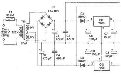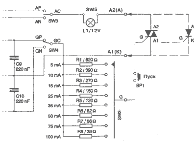 Пробник позволяет контролировать правильное функционирование симистора или тиристора. Работоспособность проверяемого элемента можно оценить, задавая отпирающий ток управляющего электрода. Так, для симистора можно показать отличие его поведения в зависимости от способа отпирания: I, II, III и IV. С помощью такого прибора легко определяется сопротивление в цепи управляющего электрода, достаточное для правильного запуска. Основа пробника - переключатель с резисторами R1 - R8, которые задают ток управляющего электрода тиристора или симистора. Положительное или отрицательное управляющее напряжение позволяет отпирать тестируемый элемент двумя способами. Выбор полярности управляющего тока осуществляется с помощью переключателя SW4. Другой переключатель (SW3) позволяет выбрать полярность питания между рабочими электродами проверяемого элемента или полностью его отключить. Описание схемыПринципиальная электрическая схема устройства представлена на рис. 1. Питающий трансформатор TR1 снижает сетевое напряжение 220 В и обеспечивает гальваническую развязку между сетью и цепями пробника. Вторичная обмотка TR1 выполнена со средней точкой, откуда снимается напряжение с эффективным значением примерно 2x9 В. Двухполупериодный выпрямитель собран на диодном мосте D1. Сглаживание положительного и отрицательного напряжений обеспечивается конденсаторами С1 - С4. Напряжение на контакте АР относительно общего провода (А1) составляет примерно +11 В, в то время как напряжение на контакте AN составляет около -11 В. Переключателем SW3 изменяется полярность напряжения питания лампы. Стабилизированное напряжение питания ±5 В вырабатывается с помощью стабилизаторов положительного напряжения (7805) и отрицательного напряжения (7905) и обеспечивает нормированный ток управления. Диоды D2 и D3 не допускают резкого падения входного напряжения стабилизаторов при отпирании тестируемого тиристора или симистора. Величину управляющего тока определяют резисторы R1 - R8, включаемые в цепь управляющего электрода с помощью переключателя SW2. Напряжение на управляющем электроде тиристора или симистора составляет примерно 1 В, поэтому величина управляющего тока рассчитывается по следующей формуле: Iу=4/R Сопротивление R соответствует сопротивлению в цепи управляющего электрода тиристора или симистора. Пробник позволит определить максимальное значение этого сопротивления для различных способов запуска с напряжением управления 5 В. Различные способы отпирания симистора реализуются посредством четырех возможных комбинаций положений переключателей SW3 и SW4. Для тиристора используется единственный режим + + (см. табл.), который соответствует положению АР переключателя SW3 и положению GP переключателя SW4.