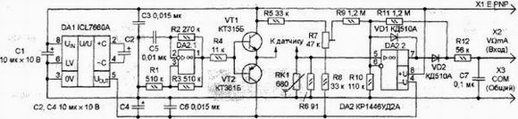 Приставка, предлагаемая вниманию читателей, расширяет возможности мультиметра М-830В (DT-830B), позволяя измерять концентрацию растворенных в воде солей. С ее помощью можно оценить пригодность питьевой, "качество" дистиллированной воды, отличить настоящую минеральную воду от поддельной. Приставка питается от мультиметра и не требует дополнительных подключений внутри него. Вода, как известно, необходима для существования живых организмов. Достаточно сказать, что в теле человека она составляет около 65 % его массы, содержится во всех клетках и тканях и все жизненные процессы протекают с ее участием. Яркий пример, подтверждающий важность этого вещества: при наличии воды человек может прожить без пищи около месяца, без воды - только несколько дней. Однако не всякая вода, даже прозрачная и чистая на вид, пригодна для питья, поэтому прежде чем попасть в водопровод, она проходит соответствующую очистку. Качество водопроводной воды в значительной мере зависит от количества содержащихся в ней солей. По санитарным нормам Госкомсанэпидемнадзора России общая концентрация растворенных в воде солей (так называемая общая минерализация) не должна превышать 1000 мг/л [1]. Воду, в которой содержание солей больше, считают минеральной. Для измерения степени минерализации применяют специальное оборудование. В связи с ухудшающейся во всем мире экологической обстановкой многие фирмы начали выпускать приборы для экспресс-анализа параметров воды. Один из них - TDS-метр фирмы Zepter [2], измеряющий количество растворенных частиц (Total Dissolved Solids - отсюда и название - TDS-метр) на миллион молекул воды. Численно его показания равны общей минерализации, измеренной в миллиграммах на литр. Цена TDS-метра весьма высока - 112 долл. США. Однако подобный прибор можно собрать самостоятельно, причем затраты на его изготовление будут невелики. Принцип измерения подобных устройств основан нa зависимости электрической проводимости воды от количества растворенных солей. Из физики известно, что проводимость раствора определяется формулой [3] S=F*Zp*np*(Up+Um)/Na, где F=96,5*10^3 Кл/моль - число Фарадея; Na=6,02*10^23 моль^-1 - число Авогадро; Zp - валентность положительно заряженных ионов в растворе; np - число положительно заряженных ионов в единице объема электронлита; Up, Um - подвижность соответственно положительно и отрицательно заряженных ионов. Формула наглядно показывает, что проводимость пропорциональна концентрации растворенных соединений. Конечно, она зависит от растворенного вещества и температуры раствора [4], но считают, что средней концентрации 1000 мг/л примерно соответствует электропроводность 0,2 См/м [5].Таким образом, чтобы определить степень минерализации воды, достаточно измерить ее электрическую проводимость или сопротивление. Чтобы исключить влияние электролиза раствора на результат, измерения необходимо проводить на переменном токе. Предлагаемый прибор выполнен в виде приставки к широко распространенному мультиметру М-830В [6] или его аналогу DT-830B, которая преобразует результаты измерения проводимости в напряжение. Питается она напряжением 3 В от внутреннего стабилизатора микросхемы ICL7106 мультиметра. Потребляемый ток при не погруженных в воду электродах датчика не превышает 0,25 мА. Погрешность измерения прибора оценивалась сравнением его показаний с показаниями упомянутого выше TD