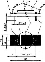 Рис.3. Чертеж датчика При использовании термистора другого типа размеры и число площадок фольги основания, возможно, придется изменить, главное, чтобы термистор был надежно припаян к фольге. Следует помнить, что от качества изготовления датчика зависит точность измерений, поэтому диаметр штырей, длина их выступающих из основания частей и расстояние между ними должны быть выдержаны в указанных на рис.3 пределах. В налаживании прибор не нуждается. Единственное, что надо сделать, - это подключить его к мультиметру, включенному на пределе измерения напряжения 2000 мВ, и подстроечным резистором R7 установить нулевые показания. Для проверки к контактам датчика подсоединяют резистор сопротивлением 1,5 кОм: мультиметр должен показать напряжение около 1000 мВ. При работе с прибором следует помнить, что термистор обладает тепловой инерцией, поэтому отсчитывать показания можно только спустя 1... 1,5 мин после погружения датчика в воду (когда они перестанут изменяться). Источники