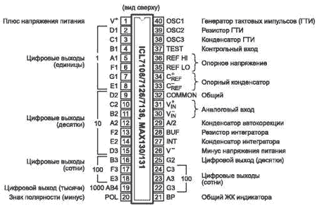 Рис. 2. Цоколевка АЦП 7106 в корпусе DIP-40 Рассмотрим схему мультиметра М832 фирмы Mastech (рис. 3). На вывод 1 IC1 подается положительное напряжение питания батареи 9 В, на вывод 26 - отрицательное. Внутри АЦП находится источник стабилизированного напряжения 3 В, его вход соединен с выводом 1 IC1, а выход - с выводом 32. Вывод 32 подсоединяется к общему выводу мультиметра и гальванически связан с входом СОМ прибора. Разность напряжений между выводами 1 и 32 составляет примерно 3 В в широком диапазоне питающих напряжений - от номинального до 6,5 В. Это стабилизированное напряжение подается на регулируемый делитель R11, VR1, R13, ас его выхода -на вход микросхемы 36 (в режиме измерения токов и напряжений). Делителем задается потенциал U ег на выводе 36, равный 100 мВ. Резисторы R12, R25 и R26 выполняют защитные функции. Транзистор Q102 и резисторы R109, R110nR111 отвечают за индикацию разряда батареи питания. Конденсаторы С7, С8 и резисторы R19, R20 отвечают за отображение десятичных точек дисплея.