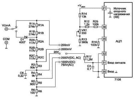 Рис. 3. Принципиальная схема мультиметра М832 Диапазон рабочих входных напряжений Umax напрямую зависит от уровня регулируемого опорного напряжения на выводах 36 и 35 и составляет: Стабильность и точность показаний дисплея зависят от стабильности этого опорного напряжения. Показания дисплея N зависят от входного напряжения UBX и выражаются числом: Рассмотрим работу прибора в основных режимах. Измерение напряженияУпрощенная схема мультиметра в режиме измерения напряжения представлена на рис. 4. При измерении постоянного напряжения входной сигнал подается на R1...R6, с выхода которого через переключатель (по схеме 1-8/1... 1-8/2) подается на защитный резистор R17. Этот резистор, кроме того, при измерениях переменного напряжения вместе с конденсатором СЗ образует фильтр нижних частот. Далее сигнал поступает на прямой вход микросхемы АЦП, вывод 31. На инверсный вход микросхемы подается потенциал общего вывода, вырабатываемый источником стабилизированного напряжения 3 В, вывод 32.