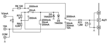 Рис. 5. Упрощенная схема мультиметра в режиме измерения тока Упрощенная схема мультиметра в режиме измерения тока представлена на рис. 5. В режиме измерения постоянного тока последний протекает через резисторы RO, R8, R7 и R6, коммутируемые в зависимости от диапазона измерения. Падение напряжения на этих резисторах через R17 подается на вход АЦП, и результат выводится на дисплей. Защита АЦП обеспечивается диодами D2, D3 (в некоторых моделях могут не устанавливаться) и предохранителем F. Измерение сопротивления