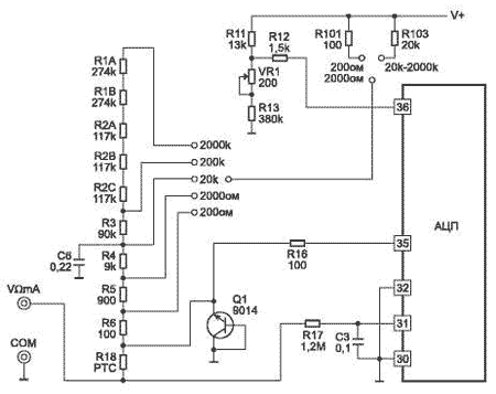 Исправность ЖК-дисплея можно проверить с помощью источника переменного напряжения частотой 50...60 Гц и амплитудой в несколько вольт. В качестве такого источника переменного напряжения можно взять мультиметр М832, у которого есть режим генерации меандра. Для проверки дисплея следует положить его на ровную поверхность дисплеем вверх, подсоединить один щуп мультиметра М832 к общему выводу индикатора (нижний ряд, левый вывод), а другой щуп мультиметра прикладывать поочередно к остальным выводам дисплея. Если удается получить зажигание всех сегментов дисплея, значит, он исправен. Вышеописанные неисправности могут появиться и в процессе эксплуатации. Следует отметить, что в режиме измерения постоянного напряжения прибор редко выходит из строя, т.к. хорошо защищен от перегрузок по входу. Основные проблемы возникают при измерении тока или сопротивления. Ремонт неисправного прибора следует начинать с проверки питающего напряжения и работоспособности АЦП: напряжения стабилизации 3 В и отсутствия пробоя между выводами питания и общим выводом АЦП. В режиме измерения тока при использовании входов V, Ω и mА, несмотря на наличие предохранителя, возможны случаи, когда предохранитель сгорает позже, чем успевают пробиться предохранительные диоды D2 или D3. Если в мультиметре установлен предохранитель, не соответствующий требованиям инструкции, то в этом случае возможно выгорание сопротивлений R5...R8, причем визуально на сопротивлениях это может никак не проявиться. В первом случае, когда пробивается только диод, дефект проявляется только в режиме измерения тока: ток через прибор протекает, но дисплей показывает нули. В случае выгорания резисторов R5 или R6 в режиме измерения напряжения прибор будет завышать показания или показывать перегрузку. При полном сгорании одного или обоих резисторов прибор не обнуляется в режиме измерения напряжения, но при замыкании входов дисплей устанавливается на нуль. При сгорании резисторов R7 или R8 на диапазонах измерения тока 20 мА и 200 мА прибор будет показывать перегрузку, а в диапазоне 10 А - только нули. В режиме измерения сопротивления повреждения происходят, как правило, в диапазонах 200 Ом и 2000 Ом. В этом случае при подаче на вход напряжения могут сгорать резисторы R5, R6, R10, R18, транзистор Q1 и пробиваться конденсатор Сб. Если полностью пробит транзистор Q1, то при измерении сопротивления прибор будет показывать нули. При неполном пробое транзистора мультиметр с разомкнутыми щупами будет показывать сопротивление этого транзистора. В режимах измерения напряжения и тока транзистор замыкается переключателем накоротко и на показания мультиметра не влияет. При пробое конденсатора С6 мультиметр не будет измерять напряжение в диапазонах 20 В, 200 В и 1000 В или существенно занижать показания в этих диапазонах. В случае отсутствия индикации на дисплее при наличии питания на АЦП или визуально заметного выгорания большого количества элементов схемы существует большая вероятность повреждения АЦП. Исправность АЦП проверяется контролем напряжения источника стабилизированного напряжения 3 В. На практике АЦП выгорает только при подаче на вход высокого напряжения, гораздо выше 220 В. Очень часто при этом в компаунде бескорпусного АЦП появляются трещины, повышается ток потребления микросхемы, что приводит к ее заметному на