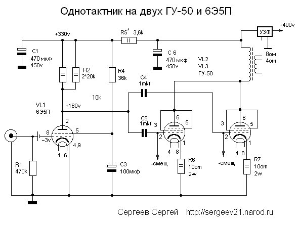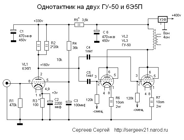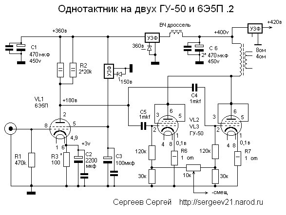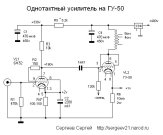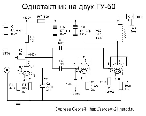Схема однотактного усилителя на 6ж52п и ГУ-50 сделана в триодном включении как первой, так выходной лампы.